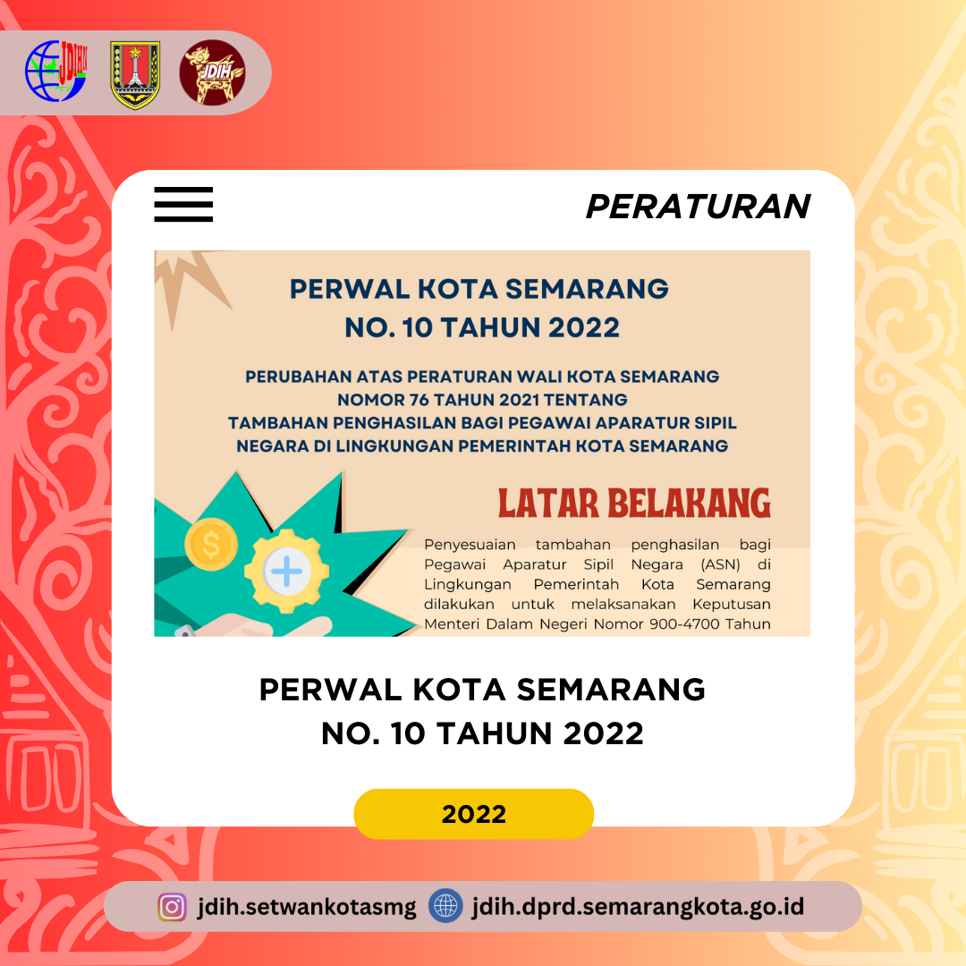 Peraturan Wali Kota Semarang Nomor 10 Tahun 2022 Tentang Perubahan Atas Peraturan Wali Kota Semarang Nomor 76 Tahun 2021 Tentang Tambahan Penghasilan Bagi Pegawai Aparatur Sipil Negara Di Lingkungan P...